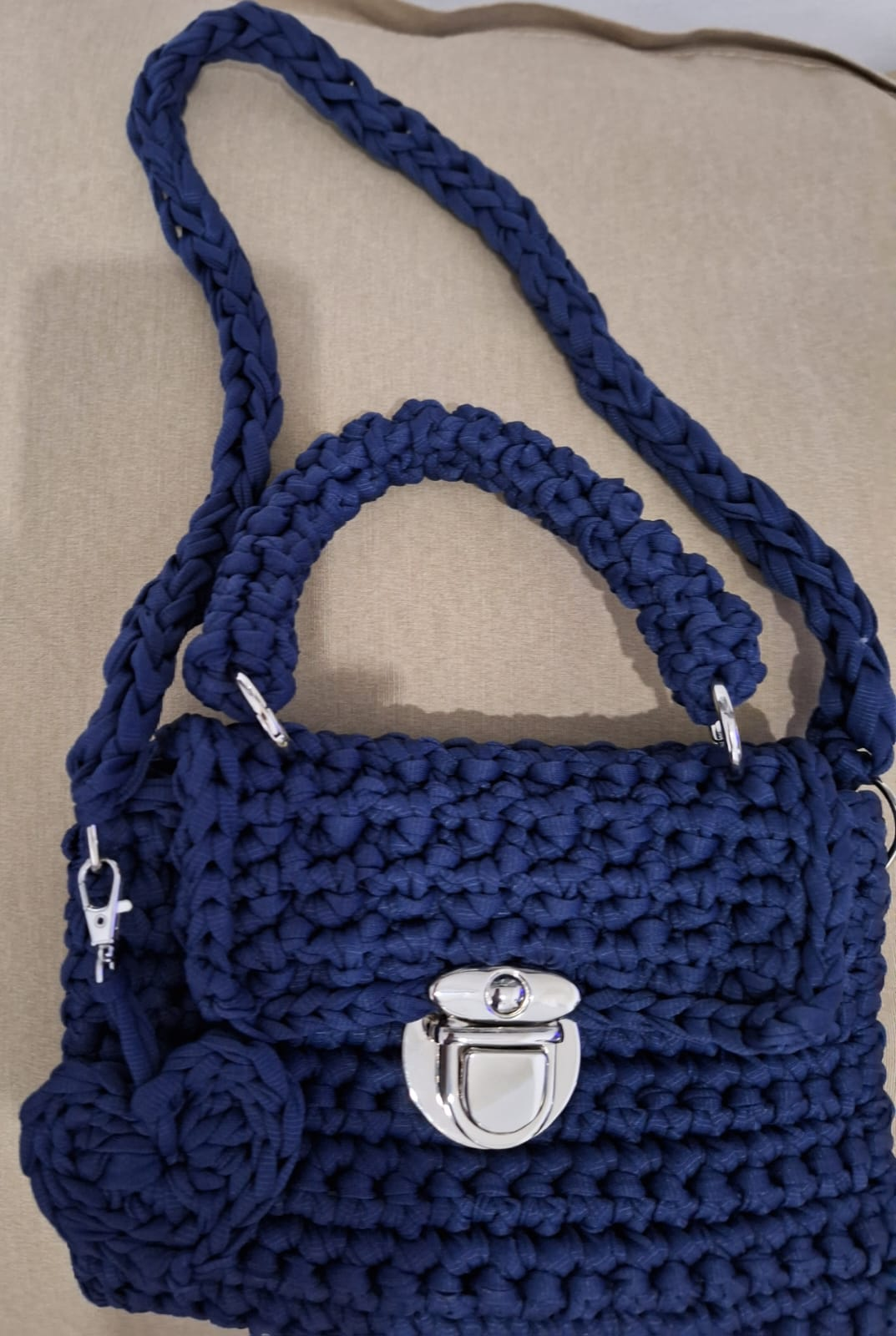 Azul marinho com fecho e corrente dourada, alça trançada.