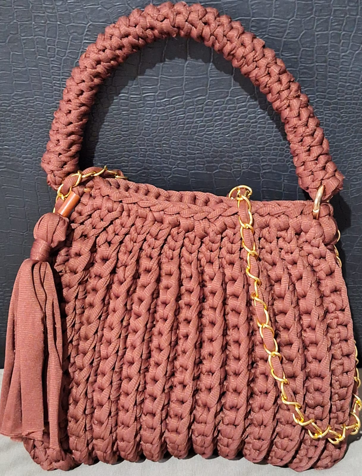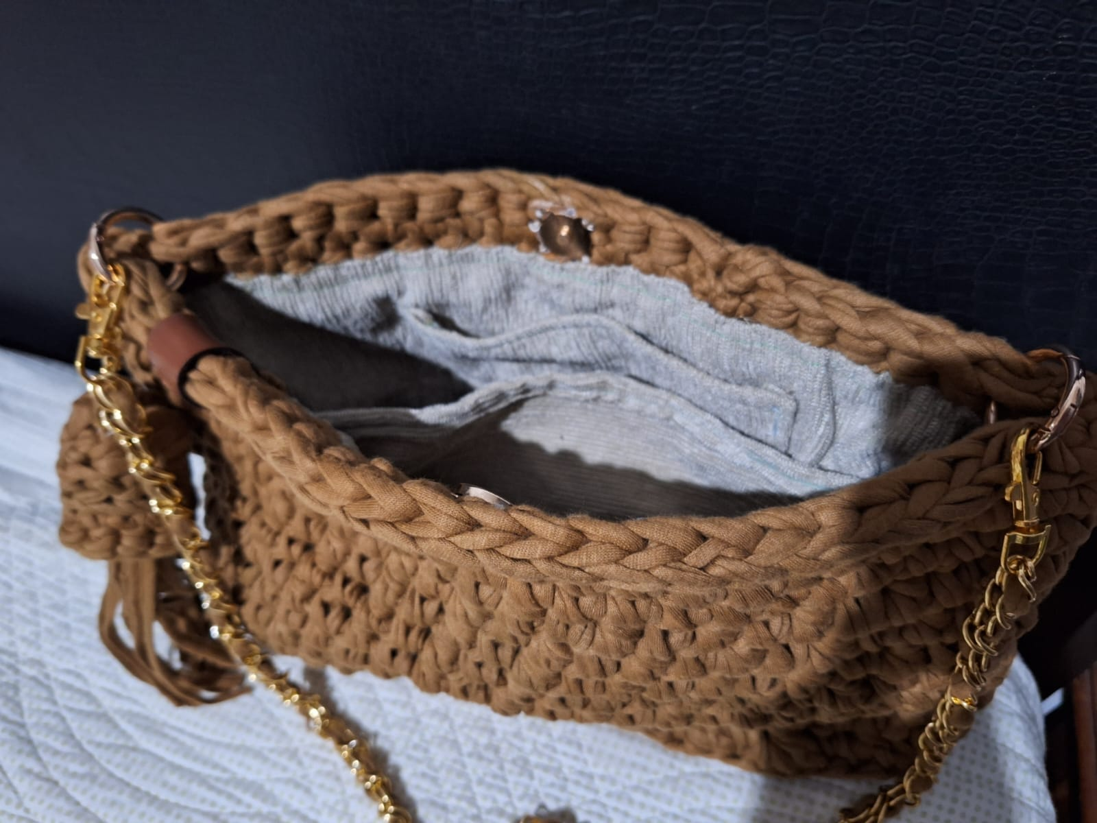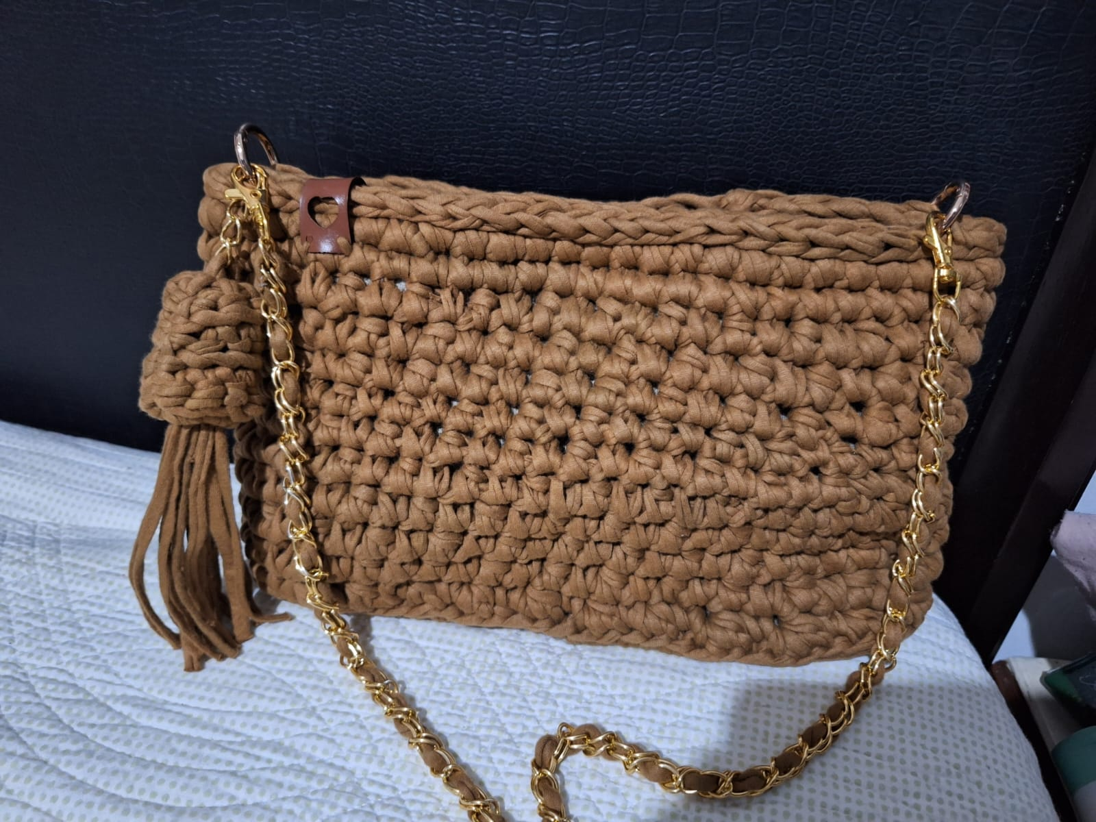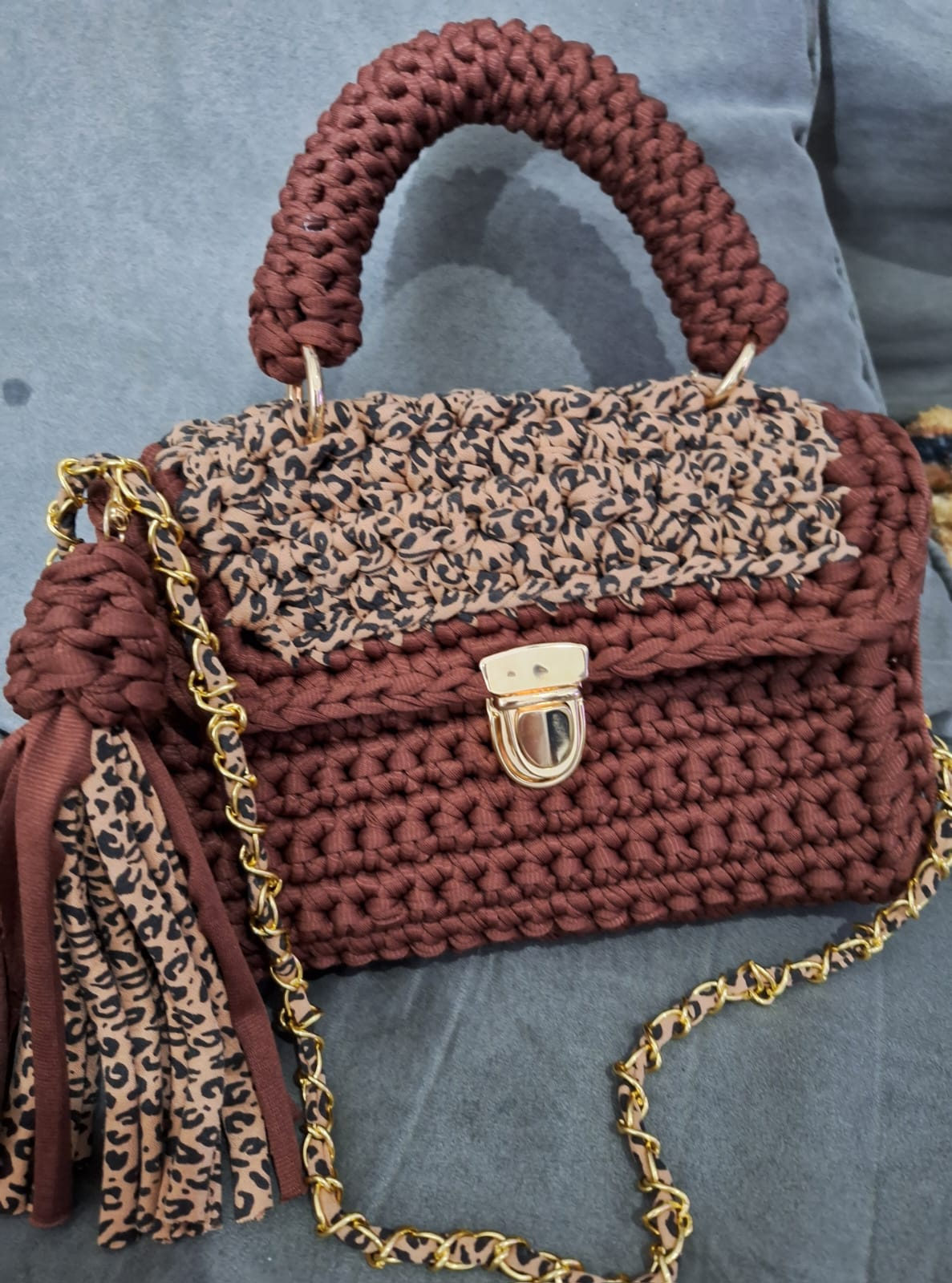 Crochê marrom com detalhe oncinha e fecho dourado.